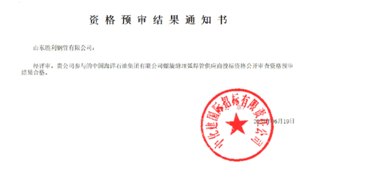 ? 2023年6月19日,山東勝利鋼管有限公司收到中化建國際招標責任有限公司書面通知: “山東勝利鋼管有限公司:經評審,貴公司參與的中國海洋石油集團有限公司螺旋縫埋弧焊管供應商投標資格公開審查資格預審結果合格?!?/span> 這表明,山東勝利成功入圍中國海洋石油集團有限公司的優選供應商,近三年內,公司將具備參與中海油螺旋縫埋弧焊管的投標資格。2023年3月24日,中國海洋石油集團有限公司發出招標公告,就中國海洋石油集團有限公司螺旋縫埋弧焊管供應商投標資格公開審查進行國內公開招標。我公司積極報名參與投標,經過精心準備,于2023年4月7日遞交了資格預審文件。本次資格審查采用有限數量制,評審方法使用綜合評審法。審查委員會按資格預審文件所附評分標準進行打分,在總得分高于75分的申請人中,按照得分排名由高到低的順序選擇前9家(不足9家時全部選取),形成候選申請人名單,進行現場考察。 資格預審文件評審結果我公司排名靠前,順利進入到現場考察階段。2023年5月19日,中國海洋石油集團有限公司考察團對我公司進行了現場考察。 現場考察采用否決制,對資格預審申請文件內容的真實性進行逐項審核??疾靾F重點考察了設備情況、提供證明文件的真實性及大管線生產記錄。公司各部門精誠合作,積極配合現場考察工作,現場考察順利通過,沒有任何問題,考察團對我公司高度認可。我公司成功通過中國海洋石油集團有限公司供應商的書面評審及現場考察,為成功進入中國海洋石油集團有限公司的優選供應商奠定了堅實的基礎。